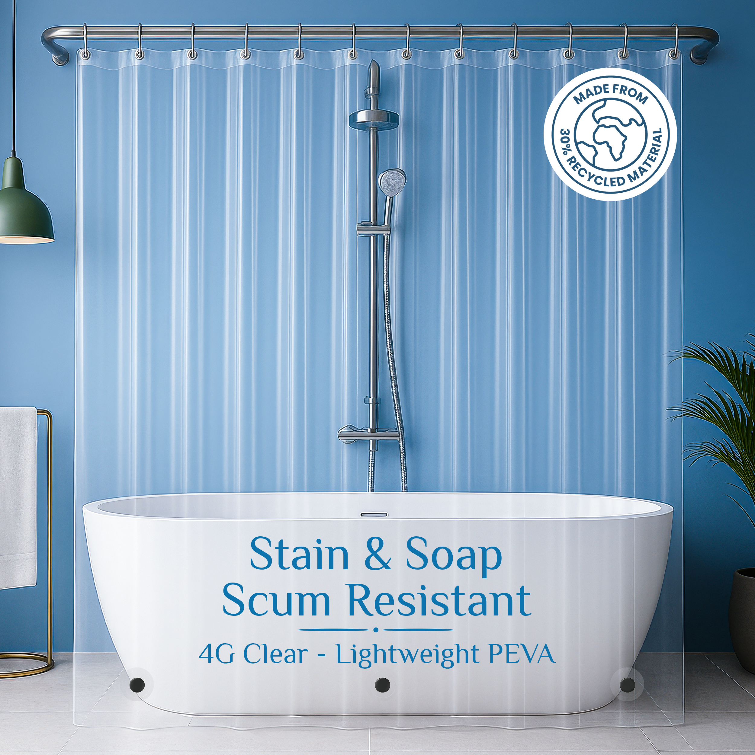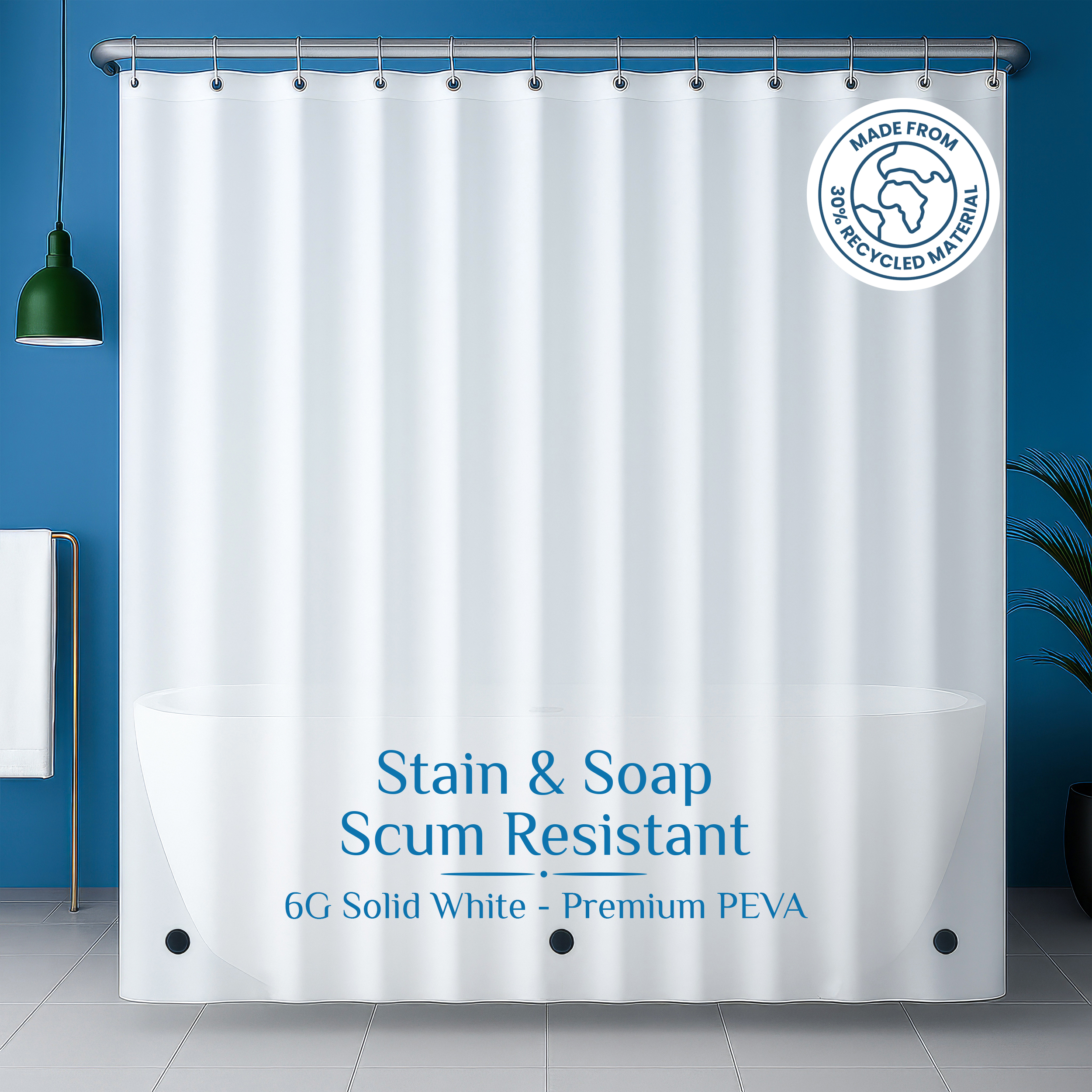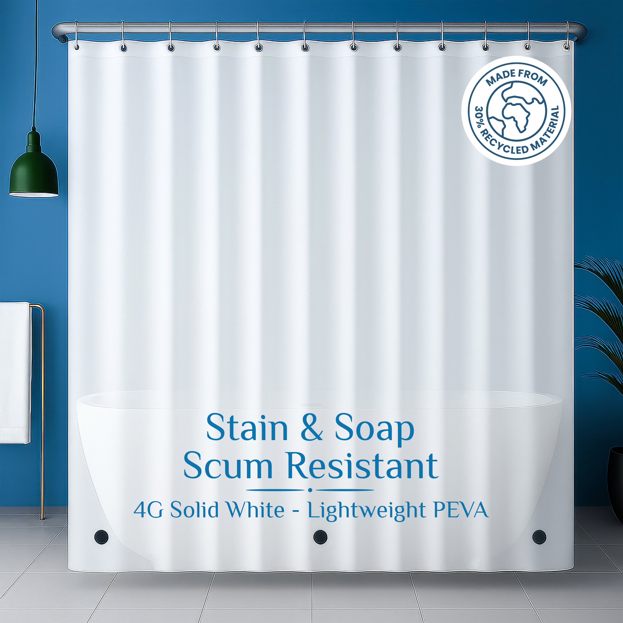 Recycled PEVA shower curtain liners that resist stains and soap scum
